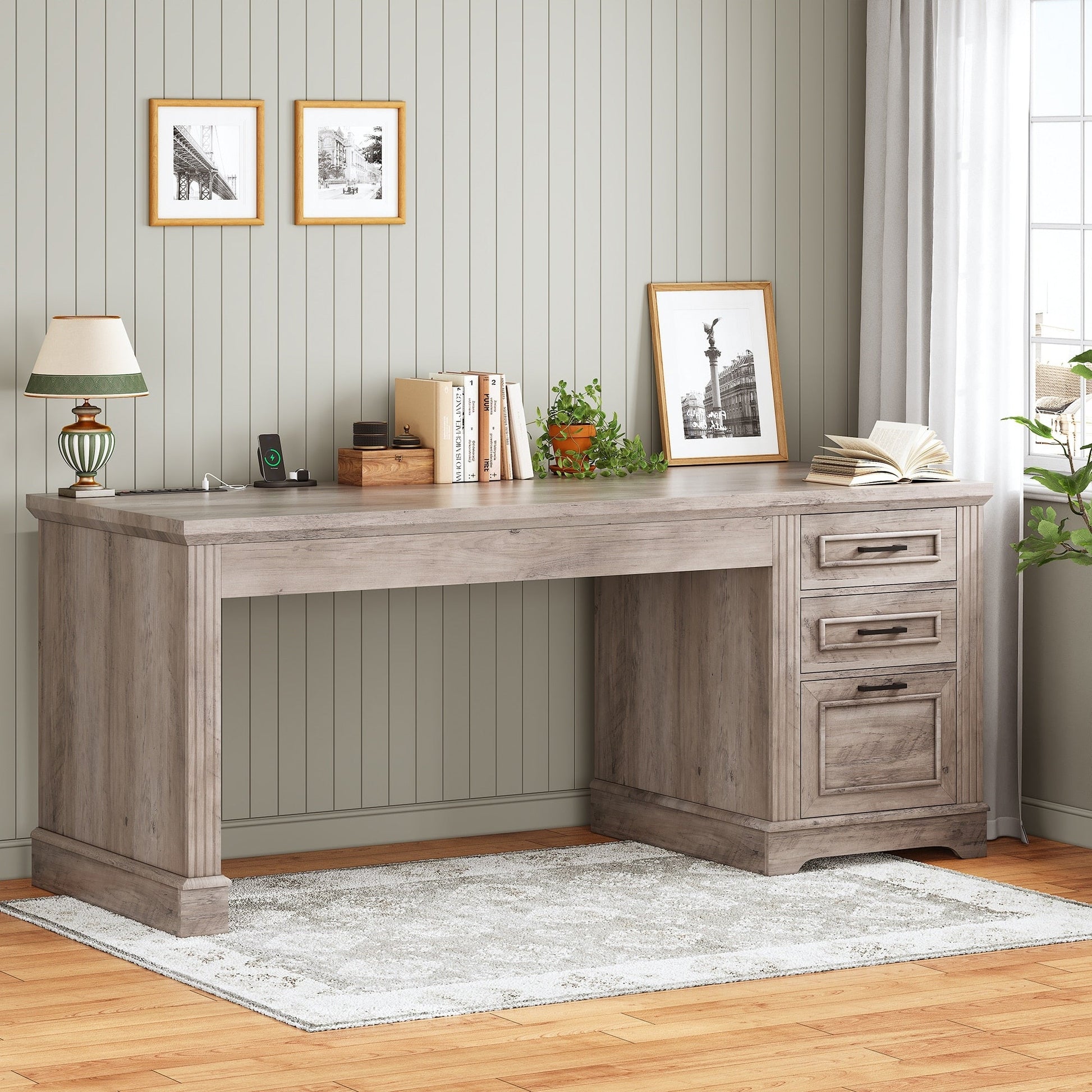 • Design campagnard : Le style classique de ce bureau en fait un ajout parfait à tout intérieur. Créez un environnement de travail unique grâce au charme et au design raffinés de ce bureau de direction de la collection. Sa conception biseautée lui confère une grande stabilité. Ses finitions soignées permettent une installation polyvalente dans votre bureau. Doté d'une quincaillerie élégante, ce bureau élégant embellira votre espace de travail en un rien de temps.