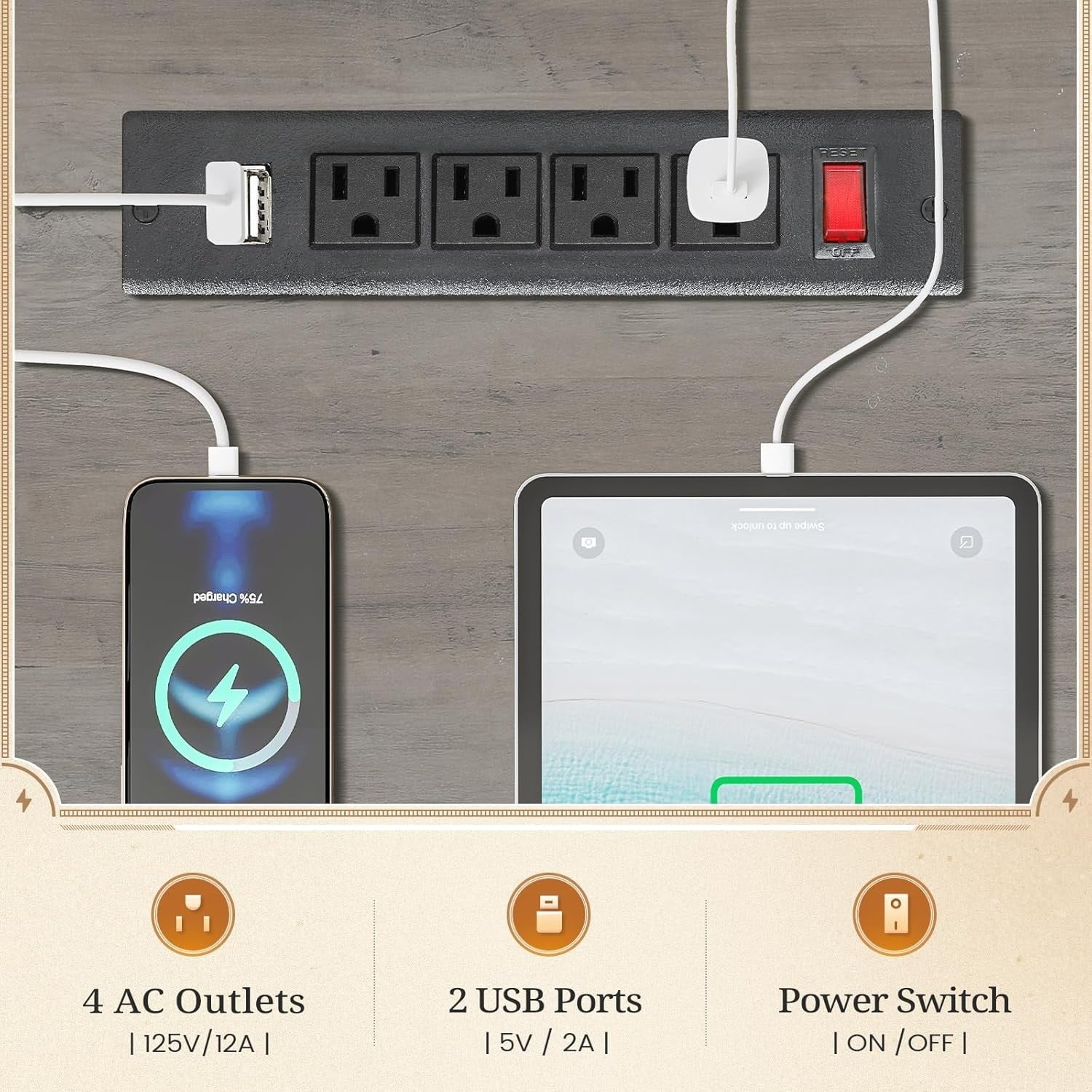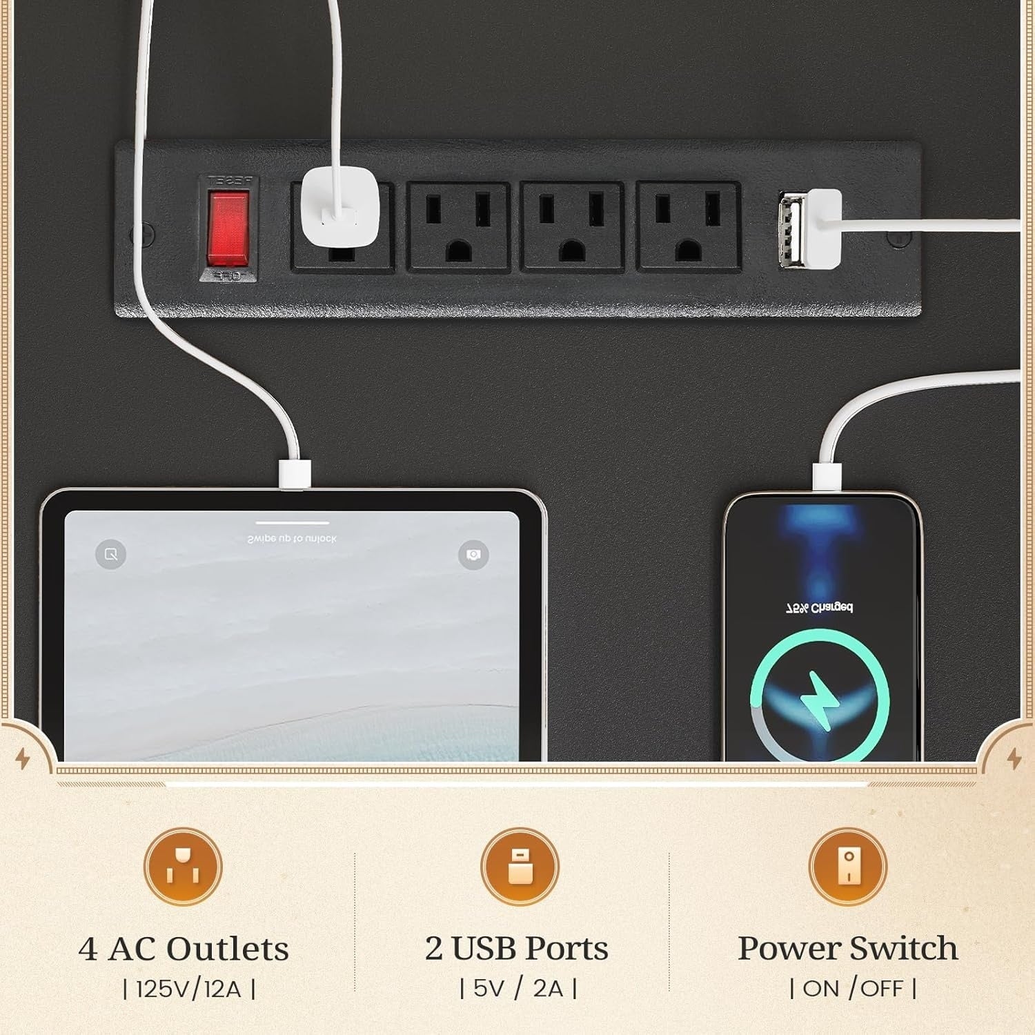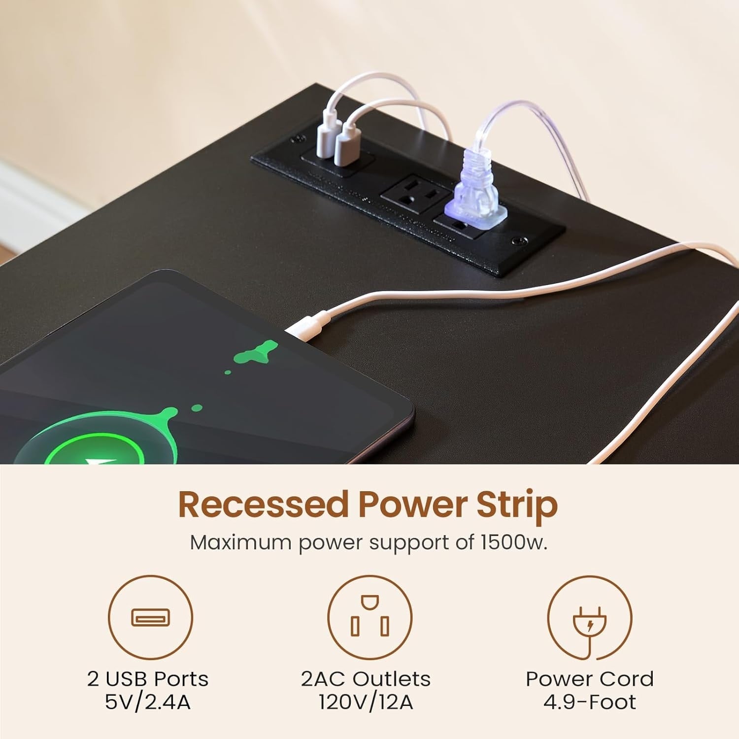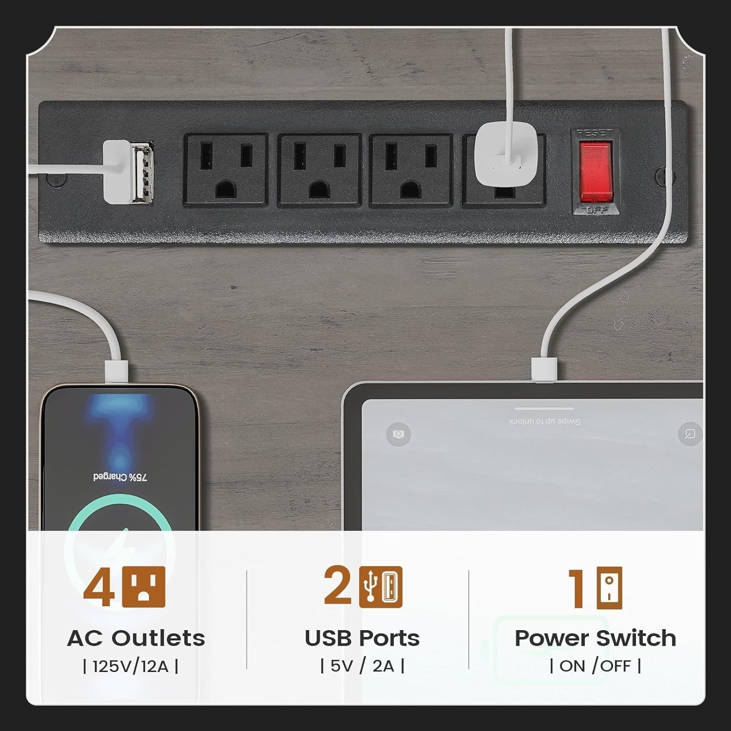 • Prises de courant : ce bureau d'ordinateur est équipé de 4 prises secteur et de 2 ports USB pour recharger facilement votre matériel de jeu, votre tablette, votre imprimante ou votre téléphone. L'interrupteur permet de couper l'alimentation facilement et en toute sécurité, sans avoir à débrancher les appareils.