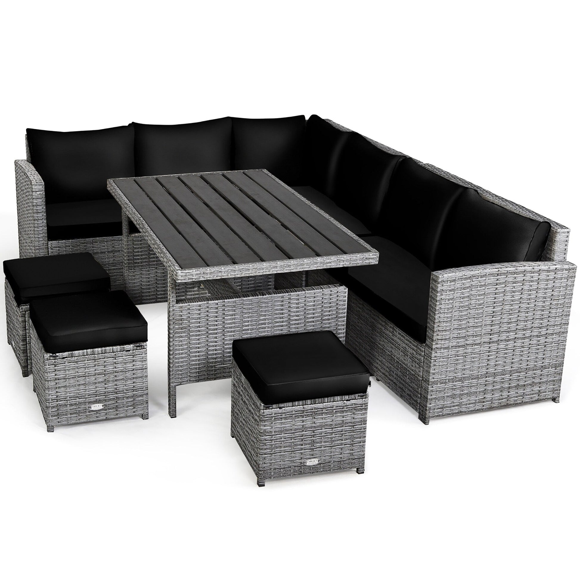 Notre ensemble de canapés en rotin 7 pièces comprend 3 fauteuils d'angle, 1 table et 3 poufs, créant ainsi un espace extérieur spacieux et confortable pour vous et votre famille. Chaque élément peut être utilisé individuellement ou combiné selon vos besoins. Grâce à sa structure en acier robuste et à son osier PE résistant aux intempéries, cet ensemble de meubles de jardin est robuste et stable pour une longue durée de vie. Ses épais coussins rembourrés en éponge offrent un confort optimal. Grâce à leurs fermetures éclair, leurs housses sont faciles à retirer et à nettoyer. La table à manger assortie, avec son grand plateau en bois synthétique, est idéale pour accueillir boissons et repas pendant vos moments de détente au soleil. De plus, ce mobilier moderne en osier s'intègre parfaitement à tous les espaces extérieurs, qu'il s'agisse de jardins, de terrasses, de jardins, de vérandas ou même d'intérieurs.