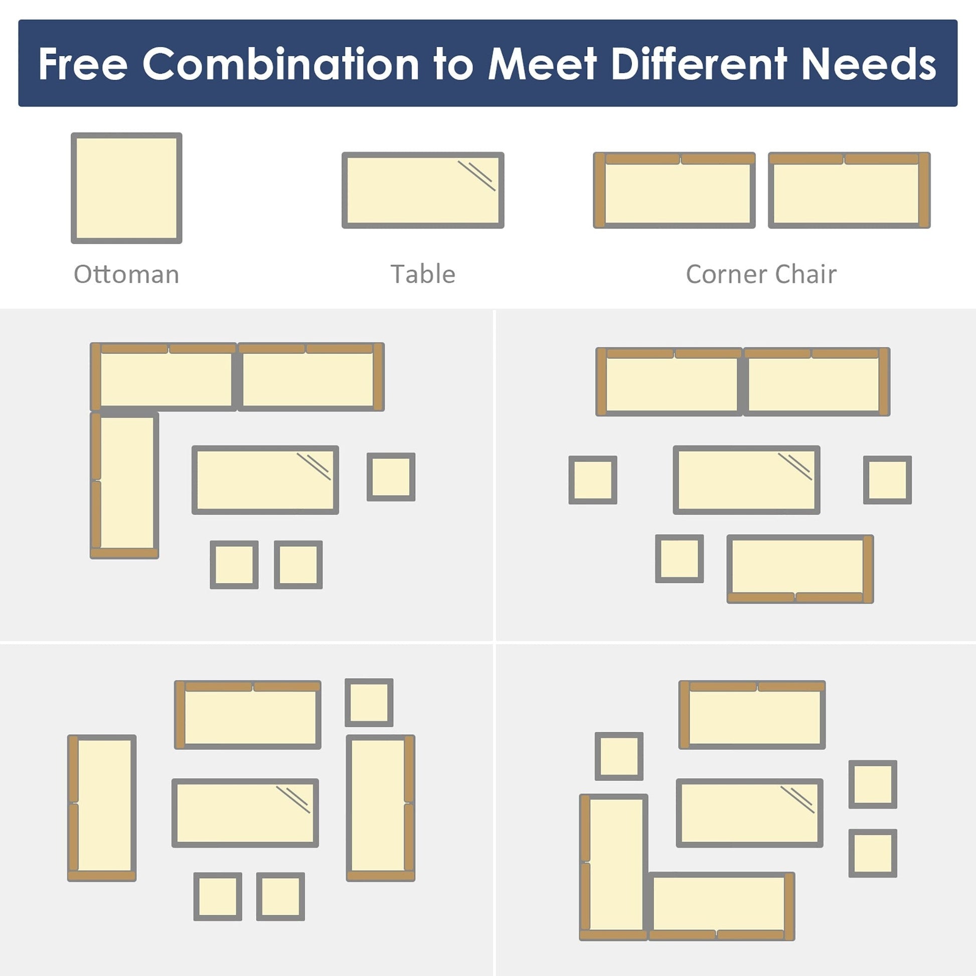 Comprend 3 chaises d'angle, 1 table et 3 poufs pour une utilisation polyvalente